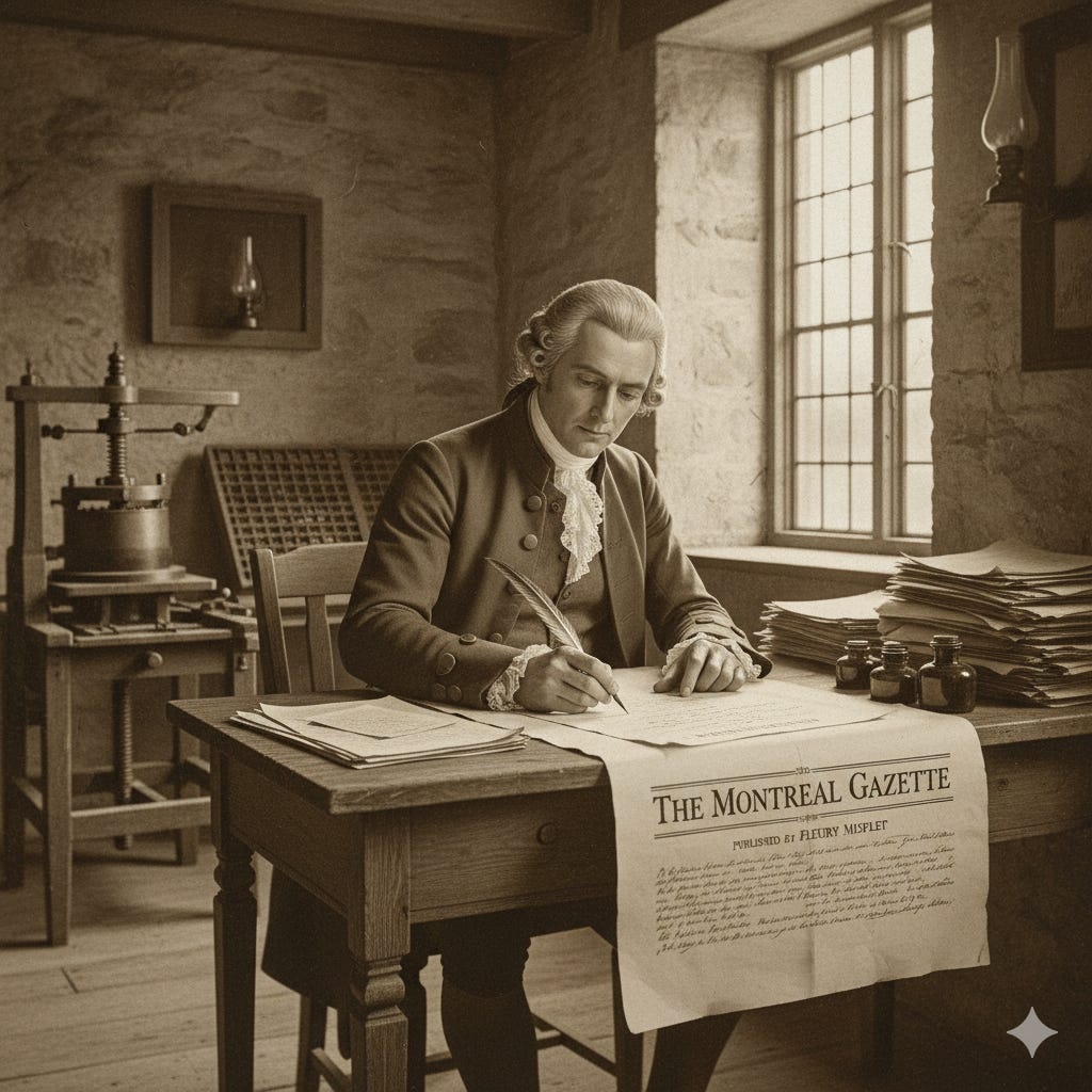It started with Fleury Mesplet. I was playing around with Google’s Gemini AI program and had asked it to create an image to look like a photo of the founder of the Montreal Gazette, Fleury Mesplet, working on an article. The Montreal Gazette is one of the oldest papers in North America, founded in 1778 by French printer Mesplet. The paper was then called Gazette Littéraire de Montréal, but I had asked Gemini to use the paper’s current name, hence the photo above.